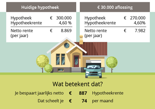 Het huis van Martijn is € 300.000 waard. Hij leent dus 100% van de waarde van zijn huis tegen bijvoorbeeld 4,6% Als hij € 30.000 aflost, leent hij nog maar 90% van de woningwaarde. Dat betekent dat Martijn in een andere risicoklasse terechtkomt. Zijn bank rekent hiervoor bijvoorbeeld een hypotheekrente van 4,2%. Martijn gaat dus 0,4% minder hypotheekrente betalen.