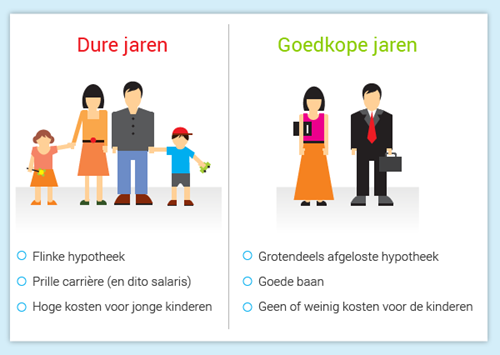 Wie kinderen heeft weet er alles van. Naast de kosten voor onder andere kinderopvang en luiers, is vaak weinig ruimte om nog te sparen. Jonge gezinnen met twee werkende ouders hebben vaak eerst te maken met een periode dure jaren. Daarna volgen de goedkope jaren: