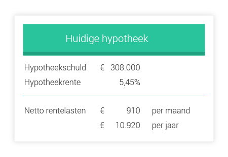 Inmiddels zijn we vier jaar verder. Wim en Marjan hebben de afgelopen jaren goed kunnen sparen en af en toe extra afgelost op hun hypotheek. De huidige hypotheekschuld is € 308.000.