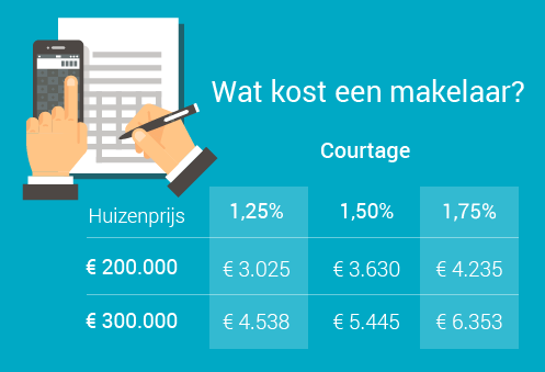 Die ervaring heeft uiteraard een prijskaartje. Een reguliere makelaar vraag tussen de 1,25% tot 1,75% courtage, exclusief btw. Inclusief btw betaal je bij een huis van € 200.000 gemiddeld € 3.630 makelaarscourtage. Bij € 300.000 bedraagt die courtage zelfs € 5.445.