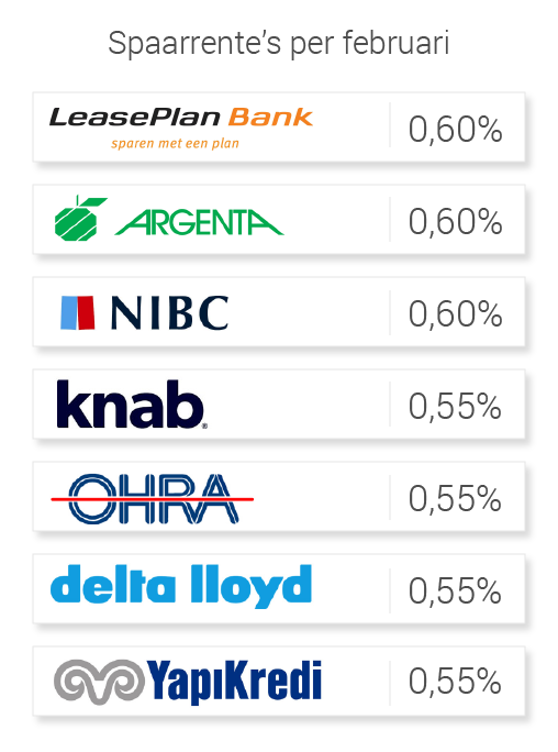 Op dit moment biedt Knab bank een spaarrente van 0,70. De hoogst haalbare rente voor een reguliere spaarrekening. Vanaf 1 februari daalt de rente bij Knab naar 0,55 procent. Nationale Nederlanden verstrekt vanaf vandaag 0,50 procent.