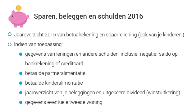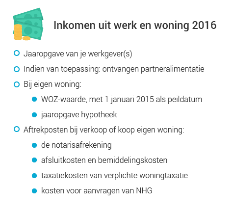 De gegevens rondom je inkomsten, hypotheek en bankrekening staan vooraf ingevuld. Aftrekposten moet je zelf invullen. De voorwaarden vind je op de website van de Belastingdienst. Dit heb je mogelijk aan gegevens nodig: