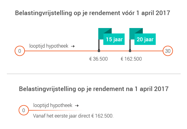 De verplichtte wachttijd vervalt per 1 april 2017. Dat betekent dat je meteen je opgebouwde vermogen belastingvriendelijk in kunt zetten om je hypotheek mee af te lossen. Je krijgt direct de maximale vrijstelling van € 162.500 op je rendement. Je kunt het geld overigens niet gebruiken om een nieuwe badkamer of auto van te kopen. Het geld valt alleen vrij voor het aflossen van je hypotheek.