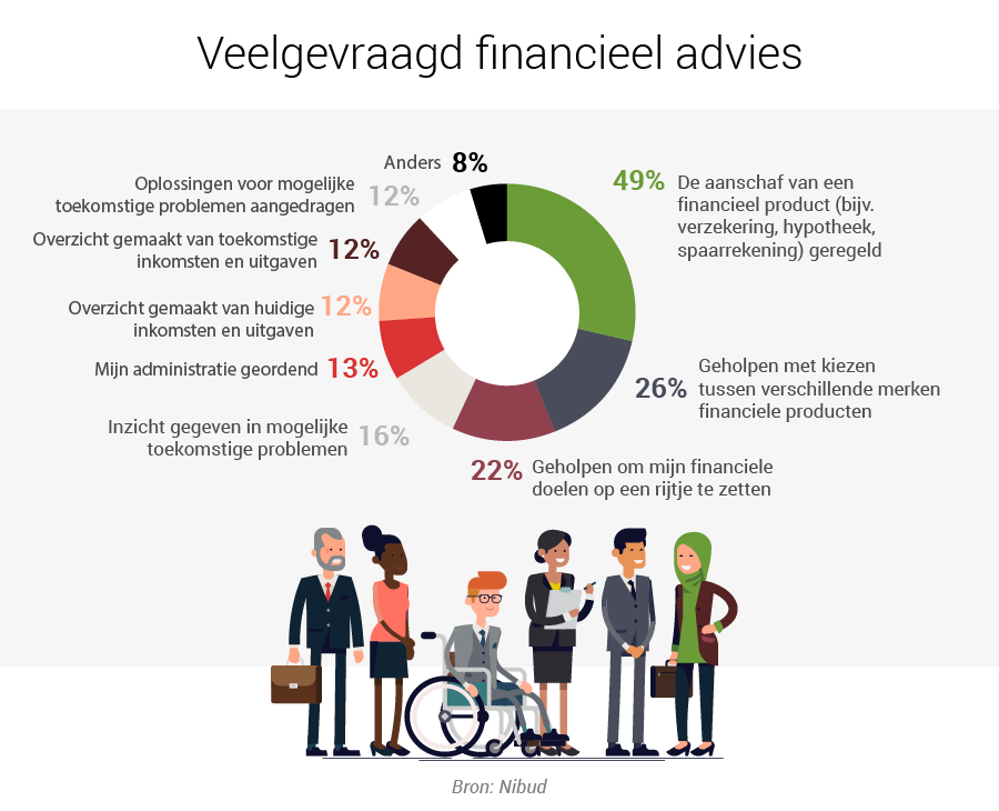 Het Nibud vroeg de klant waarvoor hij of zij een adviseur in de hand heeft genomen. Het regelen van een hypotheek, verzekering of andere financiële diens staat op nummer één. De service van financieel adviseurs gaat verder dan alleen het regelen. Ook het kiezen tussen verschillende aanbieders is een belangrijke meerwaarde. Op nummer drie staat het helpen met het op orde brengen van de persoonlijke financiën.