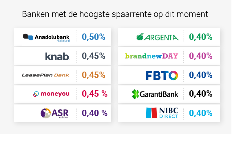 Gelukkig zijn er nog spaarbanken die iets meer te bieden hebben. Op dit moment is Anadolubank koploper met 0,50 procent. De volgende aanbieders zitten daar net onder: