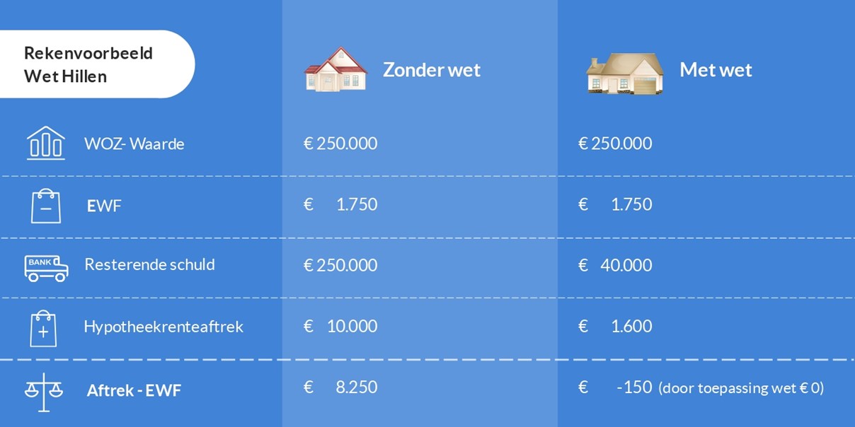 Ondanks dat de wet van Hillen langzaam wordt afgebouwd, kan het vervelend voor je zijn als jij met je goede gedrag netjes hebt afgelost. Wel gaat voor de gemiddelde woning het eigenwoningforfait tot 2024 met 0,005 procent per jaar omlaag. Dat verzacht de financiële pijn enigszins.