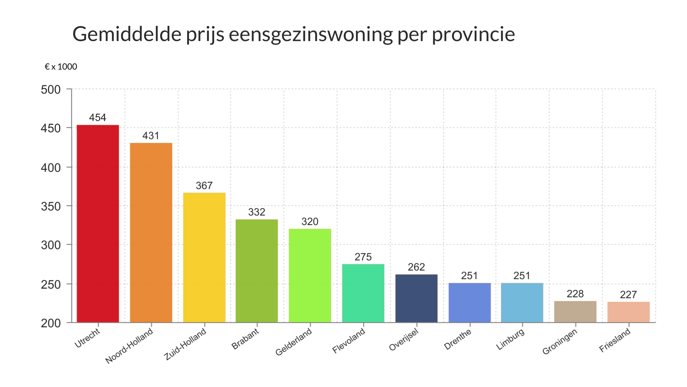 Wonen in het noorden van het land is doorgaans een stuk goedkoper dan wonen in de Randstad. In Utrecht betaal je voor een eengezinswoning gemiddeld €454.000, gevolgd door Noord-Holland met €431.000. In Groningen en Friesland ben je hiervoor respectievelijk €228.000 en €227.000 kwijt. Bron: Vereniging Eigen Huis