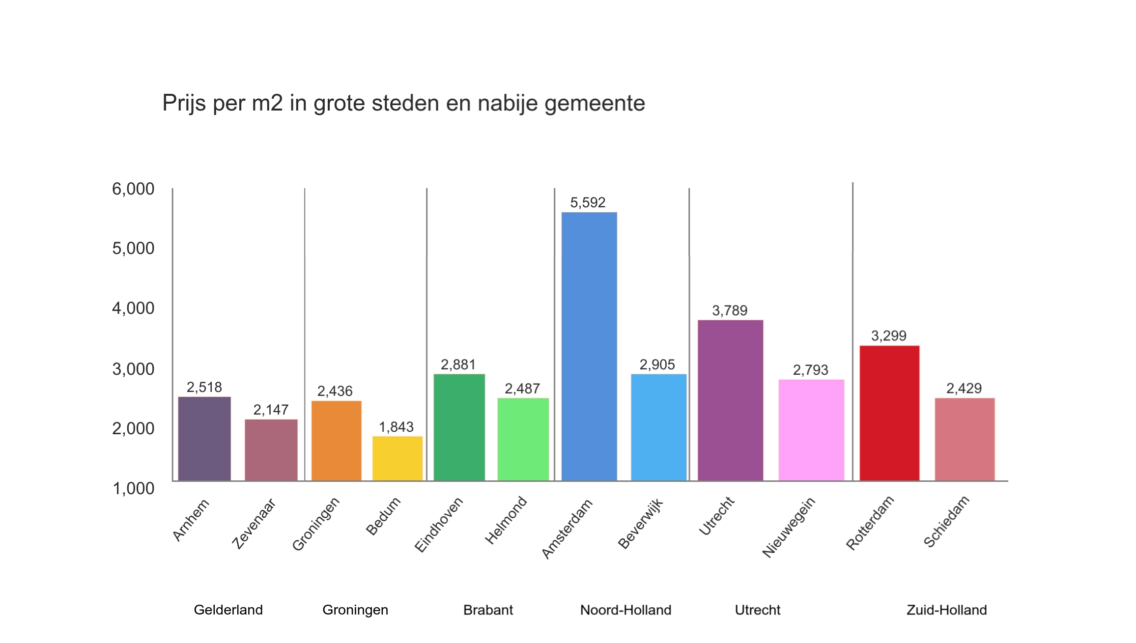 De hoeveelheid huis dat je krijgt voor een x bedrag kan flink verschillen per gemeente. Zo ben je in Laren €6.141 kwijt per vierkante meter, terwijl dit in Delfzijl maar €1.479 is. Grotere steden hebben doorgaans ook een hogere prijs per vierkante meter. Zo betaal je in Amsterdam per vierkante meter de hoofdprijs van €5.592 terwijl je in Rotterdam €3.299 en in Groningen ‘maar’ €2.436 betaald.