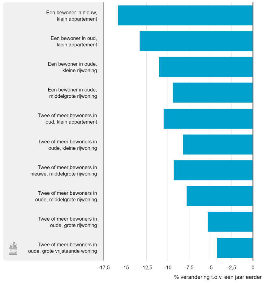 Huishoudens met een lager energieverbruik gaan er in januari 2020 meer op vooruit ten opzichte van januari 2019 dan huishoudens met een hoger verbruik. Zo gaat een eenpersoonshuishouden in een klein, nieuw appartement gemiddeld 16 procent (180 euro) minder betalen, terwijl een meerpersoonshuishouden in een grote, oude, vrijstaande woning 4 procent (140 euro) minder gaat betalen. Dit komt doordat iedereen, los van het verbruik, hetzelfde voordeel heeft van de hogere heffingskorting (216 euro). Dit vaste voordeel werkt minder door naarmate de energierekening hoger is omdat verbruik van gas en elektriciteit zwaarder wordt belast.