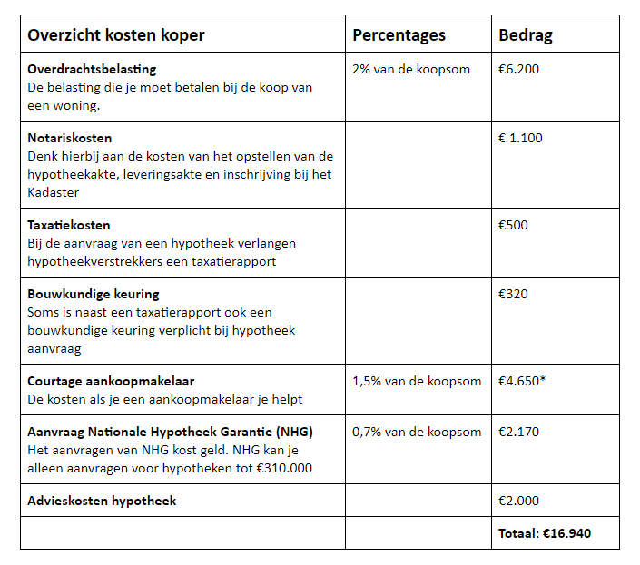 * Bij de courtage van de aankoopmakelaar hebben we de kosten ruim genomen. Naast een percentage van de koopsom kan je ook navragen of een vaste vergoeding mogelijk is. Overigens ben je niet verplicht om een aankoopmakelaar in de hand te nemen.