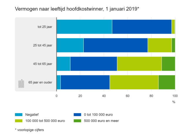 Ben je jong, heb je een startsalaris en net een huis gekocht? In die situatie heb je nog relatief weinig vermogen opgebouwd. Dat is terug te zien in de cijfers. Jonge huishoudens met een hoofdkostwinner tot 25 jaar hebben nauwelijks vermogen. Vooral 65-plussers vallen in de categorie met de hoogste vermogens. Zij bezitten vaak een eigen woning en hebben nauwelijks of geen hypotheekschuld meer. Ruim de helft van deze huishoudens had een vermogen van meer dan een ton en bij 14 procent was dat meer dan een half miljoen.