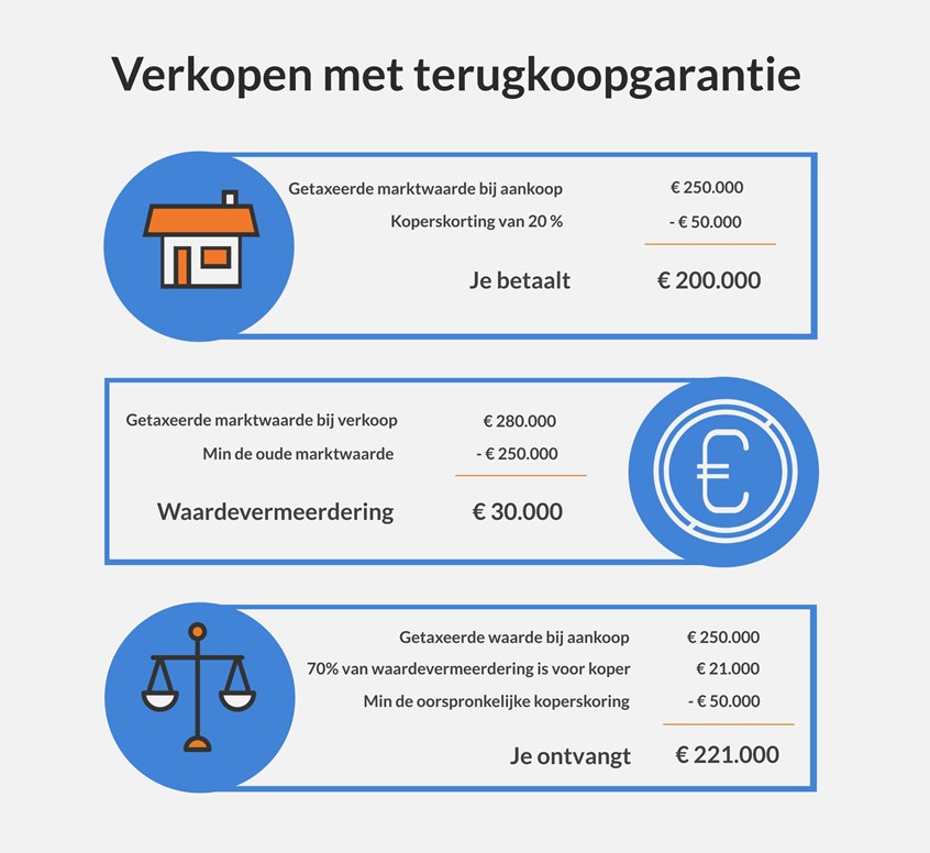 In bovenstaande illustratie is uitgegaan van winst. In een neergaande markt kan het ook zijn dat de woning minder waard wordt. Stel de waardevermindering is €50.000, in die situatie komt 70 procent van het verlies voor jouw rekening (€35.000). De terugverkoopprijs is dan €165.000. Verkopen onder voorwaarden remt je verlies, je hoeft dit immers niet helemaal zelf te dragen. Hier staat wel tegenover dat je de winst ook deelt.