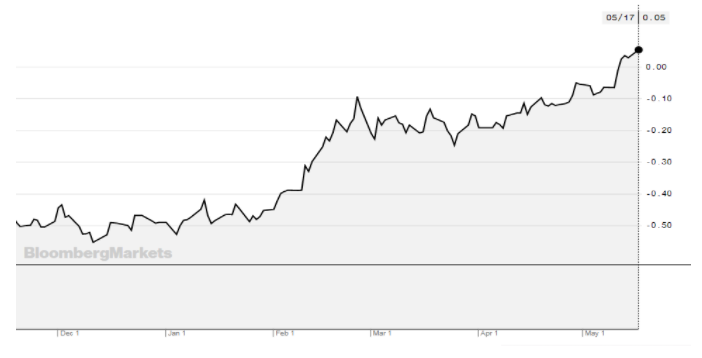 De rente op staatsobligaties (looptijd tien jaar) stijgt van -0,50 begin 2021 tot circa 0 procent in mei.