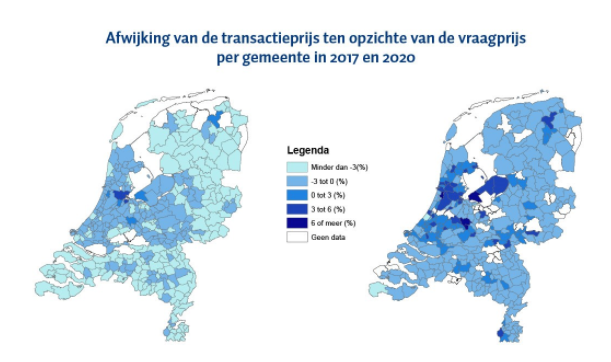 Waar overbieden al in 2017 vooral in Amsterdam en andere grote steden ‘normaal’ was, is het in 2020 de norm in heel Nederland. In circa vijftig gemeenten wordt gemiddeld meer dan 2% overboden. Almere spant de kroon. Gemiddeld wordt daar 7% boven de vraagprijs geboden. Alleen in de villadorpen (Bloemendaal, Aerdenhout, Heemstede, etc.) en in het Zeeuwse Sluis viel de koopprijs meer dan 3% lager uit dan de vraagprijs.