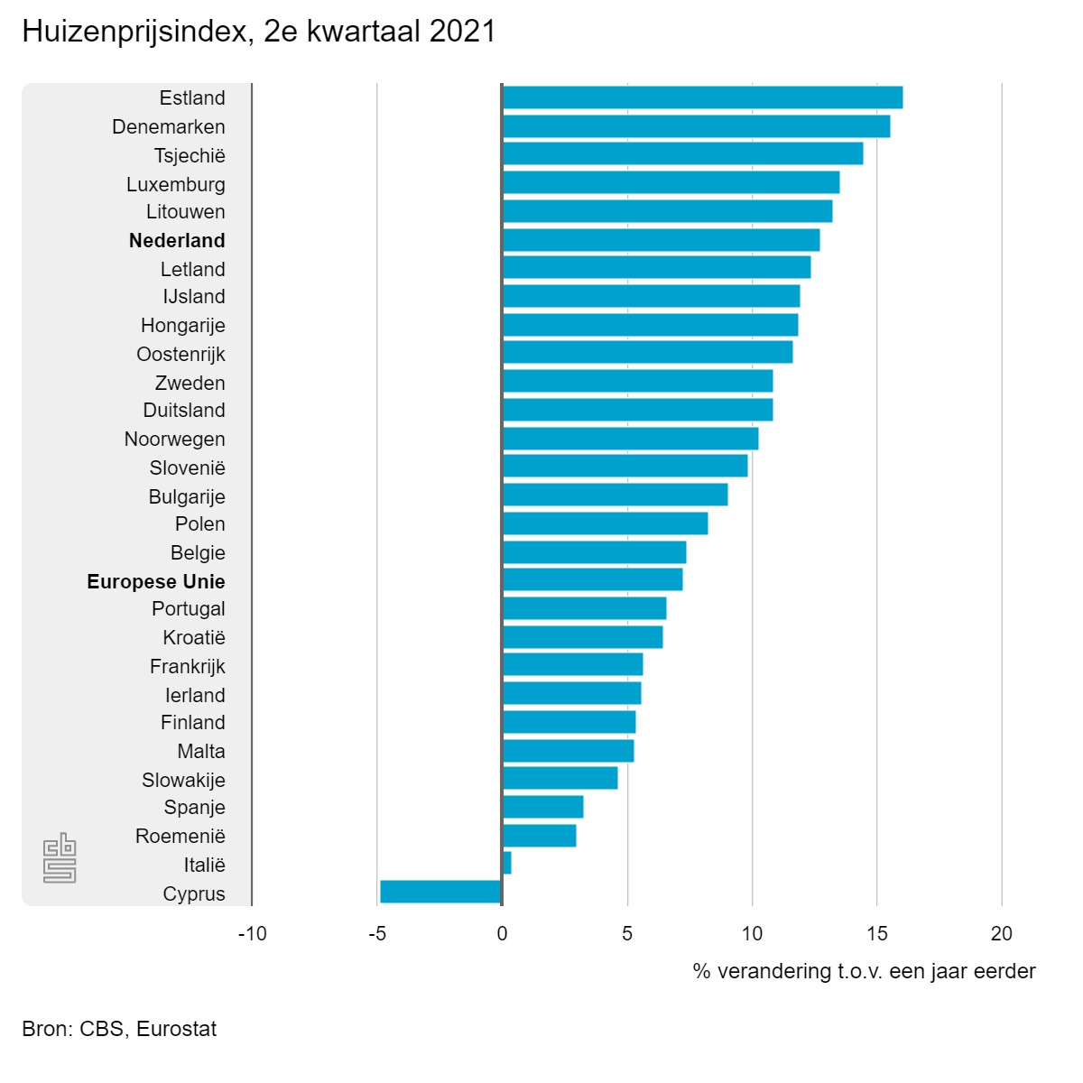 De transactieprijzen van zowel nieuwe als bestaande Nederlandse koopwoningen waren in het tweede kwartaal van 2021 gemiddeld 12,8 procent hoger dan een jaar eerder. Het kan nog gekker. In Estland is er sprake van een stijging van 16,1 procent. De top-3 wordt afgemaakt door Denemarken (+15,6 procent) en Tsjechië (+14,5 procent).