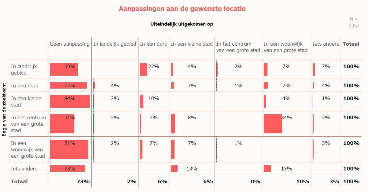 Door de schaarste aan woningen en de prijsontwikkelingen stellen veel starters hun budget naar boven bij. Bij koopstarters is dat 53 procent en bij huurders 67 procent. Van de koopstarters is 41 procent bereid het budget met meer van € 25.000 te verhogen. Ongeveer een derde van de huurders is bereid om € 200 tot € 350 meer huur te betalen. Het blijft niet alleen bij aanpassingen in het budget. Soms wordt er ook geschaafd aan de woonwensen. Vooral starters die een huis op het oog hebben in een stadcentrum zijn uiteindelijk ergens anders terecht gekomen (49%).