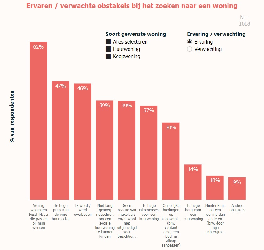 Kopers geven naast het gebrek aan passende woningen aan dat zij vaak werden overboden (65%) of dat er sprake was van oneerlijke biedingen (42%). Verder constateerden starters met regelmaat dat makelaars niet reageerden of dat ze niet werden uitgenodigd voor een bezichtiging. Van de huurders geeft 47 procent aan dat zij geen woning kunnen vinden doordat ze nog niet lang genoeg inschreven staan voor een huurwoning. De relatief hoge huurprijzen in de vrije sector zijn voor 47 procent en belemmering.