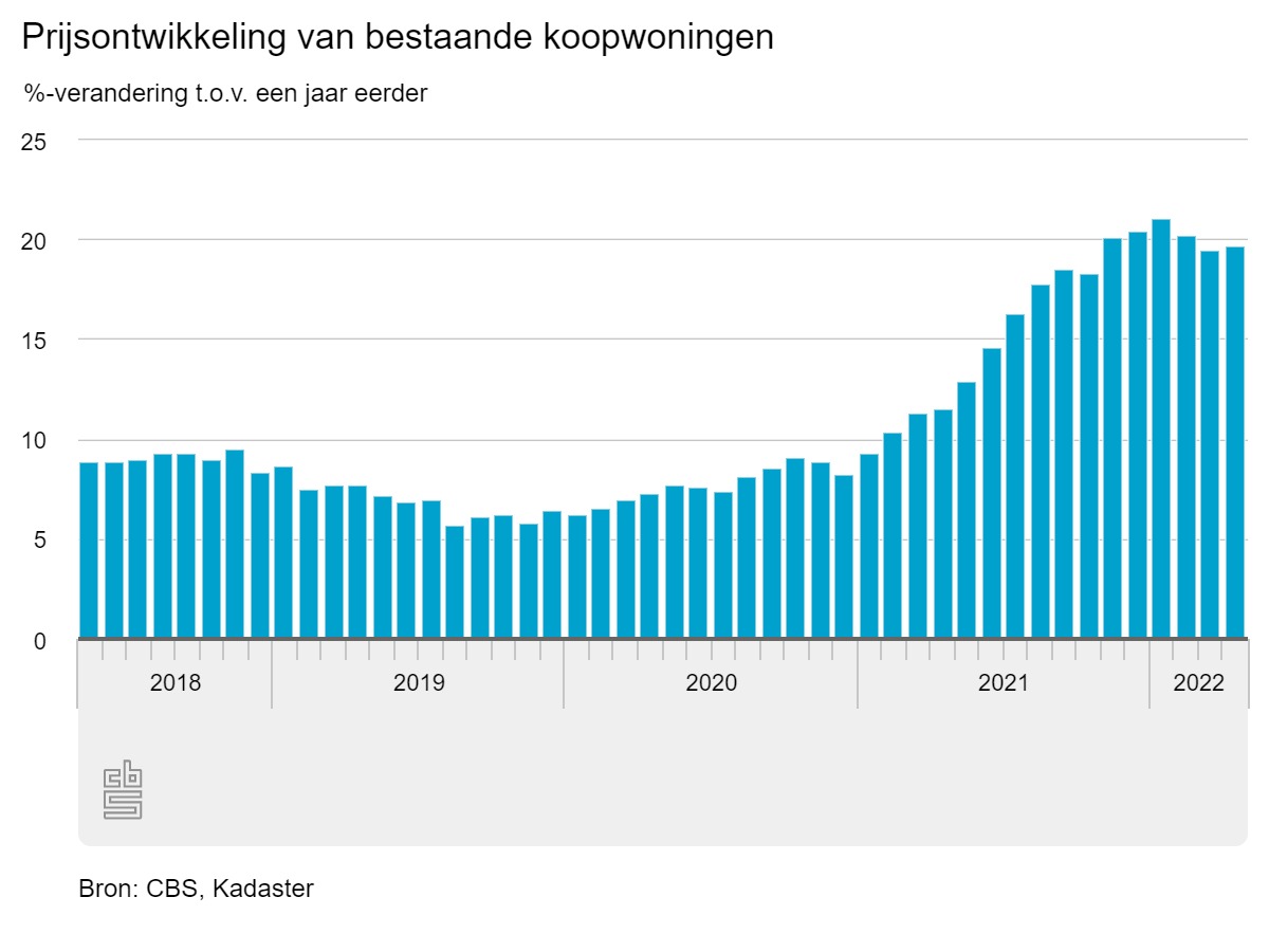 Sinds halverwege de coronacrisis zijn de prijzen van bestaande woningen op jaarbasis geëxplodeerd. In januari van dit jaar bereikte de stijging de top en betaalde je 21,1% meer voor een bestaande woning dan in dezelfde maand 2021. Toch lijkt er aan de stijgende trend een einde te komen. In februari en april zwakte de prijsstijging af, deze lijkt nu te stabiliseren rond de 19,7%.