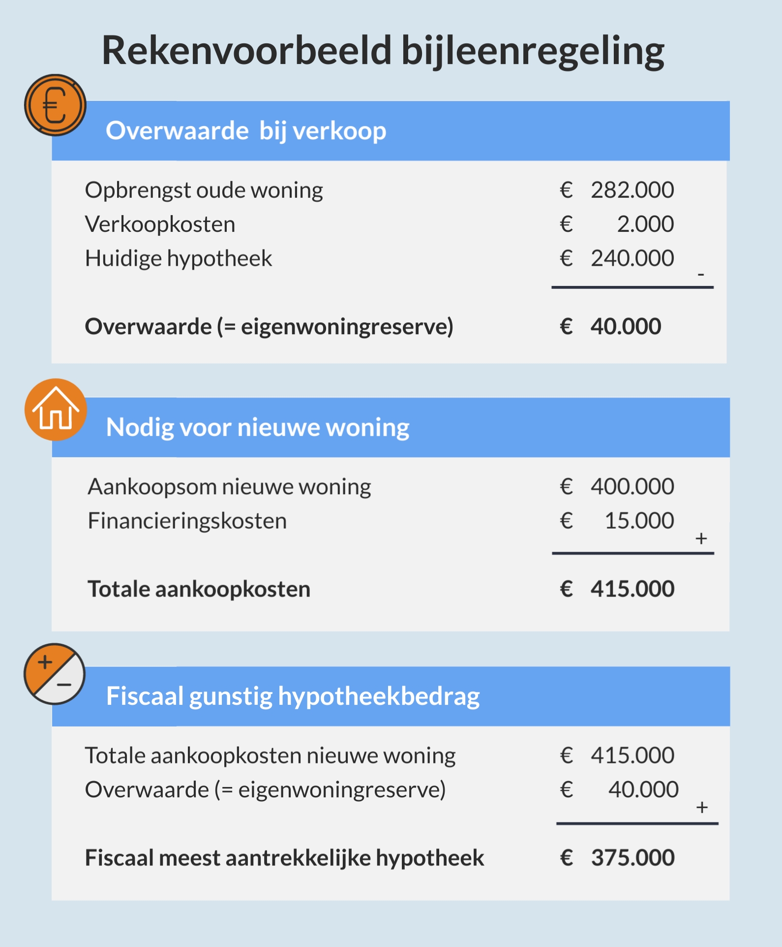 Overwaarde is het verschil tussen het verkoopbedrag en het hypotheekbedrag dat je de bank schuldig was. De fiscus noemt dit ook wel het eigenwoningreserve. De bijleenregeling stimuleert het gebruik van de overwaarde bij de aankoop van een nieuwe woning. Gebruik je het reserve niet, dan krijg je over het deel dat je bij leent geen hypotheekrenteaftrek. Daar komt dus meteen de naam van de regeling vandaan.