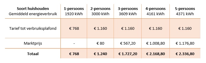 Wanneer je meer verbruikt dan het gestelde plafond, ga je over het meerdere de marktprijs betalen. Om hier een beeld van te geven, zetten we het gemiddelde verbruik op een rij voor verschillende type woningen. Daarbij houden we een gasprijs aan van € 3,60 per m3 en een stroomprijs van € 0,80 kWh. Uiteraard kan het plaatje er anders uitzien als de energietarieven stijgen of dalen.