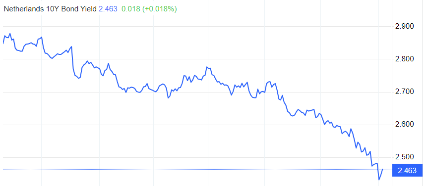 Sinds begin juni is de richting van de staatsobligaties al dalend, met een versnelling in juli. Dit is een trendbreuk, aangezien de rente sinds maart juist in een opwaartse trend zat. Aan de grafiek van de afgelopen 6 maanden valt ook te zien dat de recente daling relatief fors is. Van bijna 3 procent naar minder dan 2,5 procent in nog geen twee maanden. Voor de komende weken is afwachten in hoeverre de daling aanhoudt.