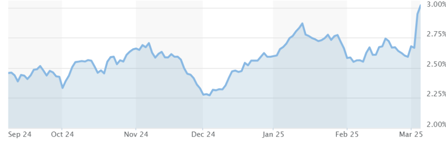 In de onderstaande grafiek is te zien dat de rente vooral is gestegen vanaf het moment dat de steun van de VS voor de oorlog in Oekraïne ter discussie stond. Steeds duidelijker werd dat een hervorming van militair Europa onvermijdelijk is, met forse financiële gevolgen. Dit nog los van de importtarieven die bekendgemaakt werden voor producten die vanuit Europa naar Amerika verscheept worden.